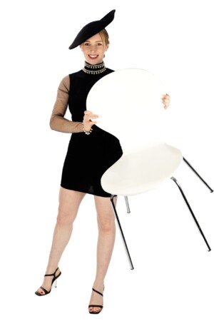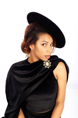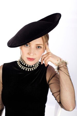 Model Photographer of female model with large black fashionable hat and pearl necklace